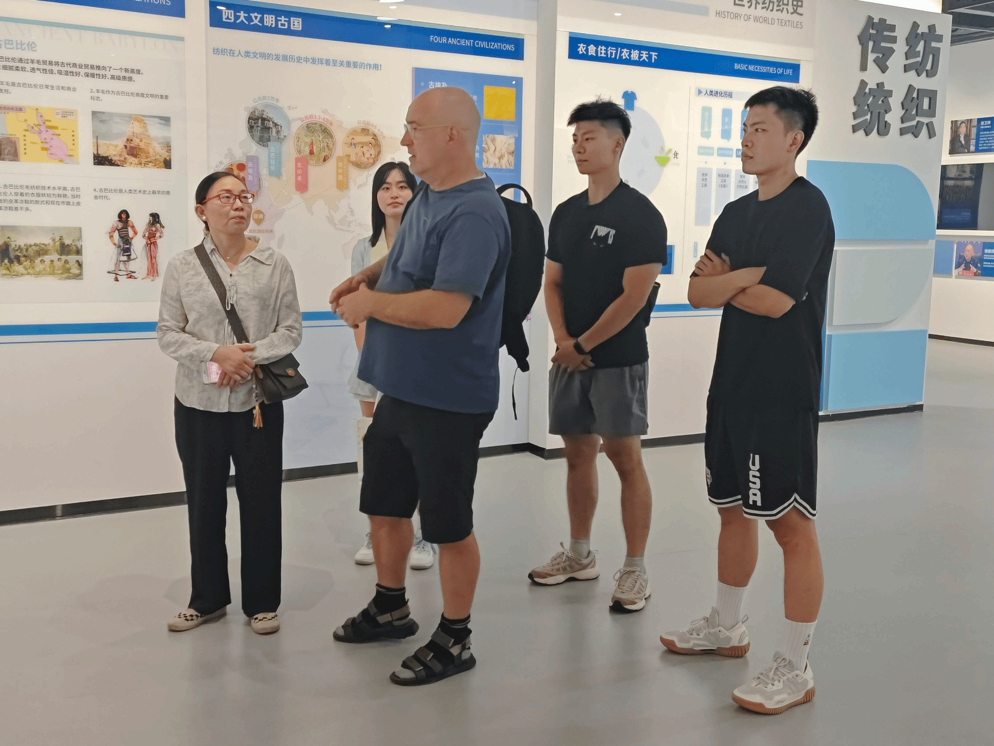 在参观过程中,我们MTI学生凭借扎实的专业功底,担任起现场讲解与翻译工作。他们首先向Sterckx教授系统介绍了中国纺织的历史脉络——从新石器时代的原始纺织工具,到汉唐时期绚丽的丝绸制品,再到宋元明清纺织技艺的精进与传播,生动展现了纺织作为中华文明重要载体的深厚底蕴。随后,学生们结合展馆史料,讲述了雷火电竞官网在纺织领域的发展历程,特别介绍了校党委书记徐卫林院士在纺织材料领域的深耕与突破。同时,学生们也向教授讲述了知名校友李建全的故事。