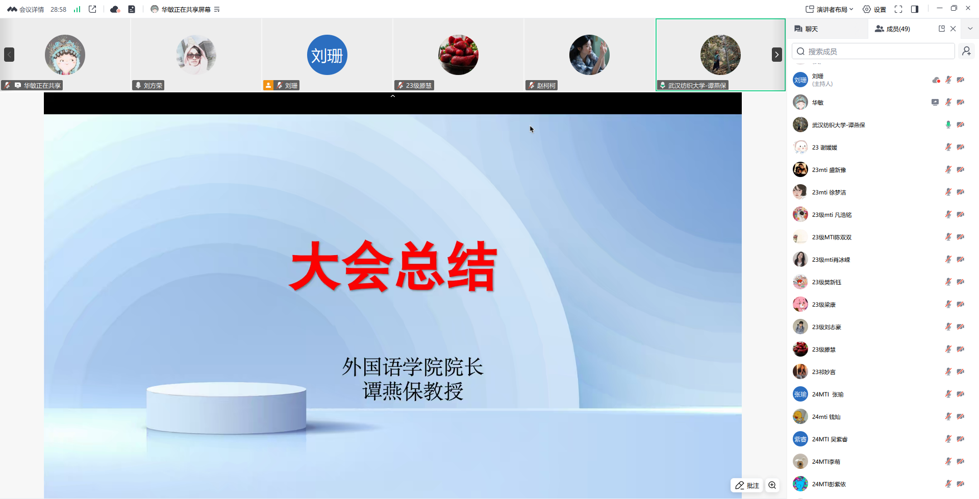 首先由MTI中心副主任华敏对23级MTI研究生实习的情况进行了总体的回顾,并将实习单位对于实习学生的总体评价进行了反馈。实习单位认为,学生工作态度佳、学用能力强,翻译水平提升明显,已具备专业翻译基础,沟通与时间管理能力突出,多数同学达成实习预期目标。多位同学也分享了各自在翻译、外事等领域的实习经历,展现了从初入职场的挑战到收获成长的蜕变历程。刘志豪、樊新钰在武汉科译汉嘉深耕医疗翻译相关工作,不仅提升了办公技能与专业素养,更适应了“机器翻译+人工校对”的行业新模式;赵柯柯、祁妙言在传神翻译参与项目时,从陌生到熟练,深刻体会到团队协作的价值与人类主观判断的不可替代性,更以钻研精神完成项目交付;盛新豫在译国译民经多岗位锻炼,学会情绪管理与高效沟通;周华科在学校国际处践行文化传播使命,坚定中外交流桥梁的搭建决心;凡浩铭在武汉语言桥团队支持下克服焦虑,领悟坚持与感恩的成长真谛。