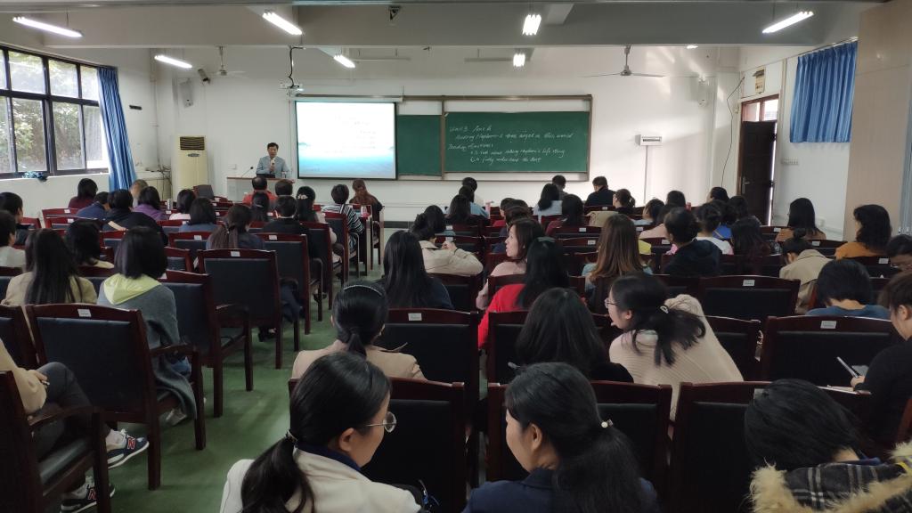 杨洪林教授从立德树人教育的根本任务和课程思政的意义出发,探讨了外语课程教学的特质和使命,详细阐释了外国语课程思政需正确处理好科学性与价值性、历史性与现实性、批判与继承、知识性与思想性、课程教学与科学研究等五大辩证关系。随后,杨教授分享了个人学术研究体会,开展理论研究既要能发现学术研究空白,也要服务国家社会发展需要,并分析了外国语学科理论研究应关注的课题,鼓励我们教职工研究创新课程教学,聚焦学术研究,要有自强不息、水滴石穿、持之以恒的精神。