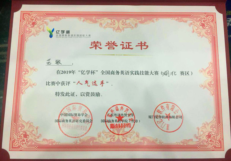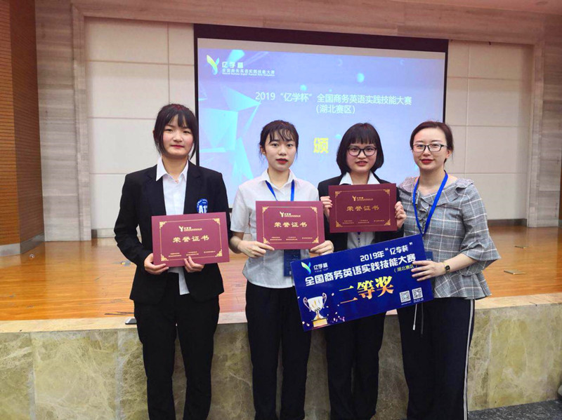 5月18日-19日,2019年“亿学杯”全国商务英语实践技能大赛湖北赛区决赛在华中农业大学举行,我们商务英语专业张苗苗、范敏、何洁三名学生代表学校参加省赛角逐,与来自华中农业大学、中南财经政法大学、湖北经济学院等24支兄弟院校团队同台竞技,荣获湖北赛区二等奖的好成绩,范敏荣获“最佳人气选手”。