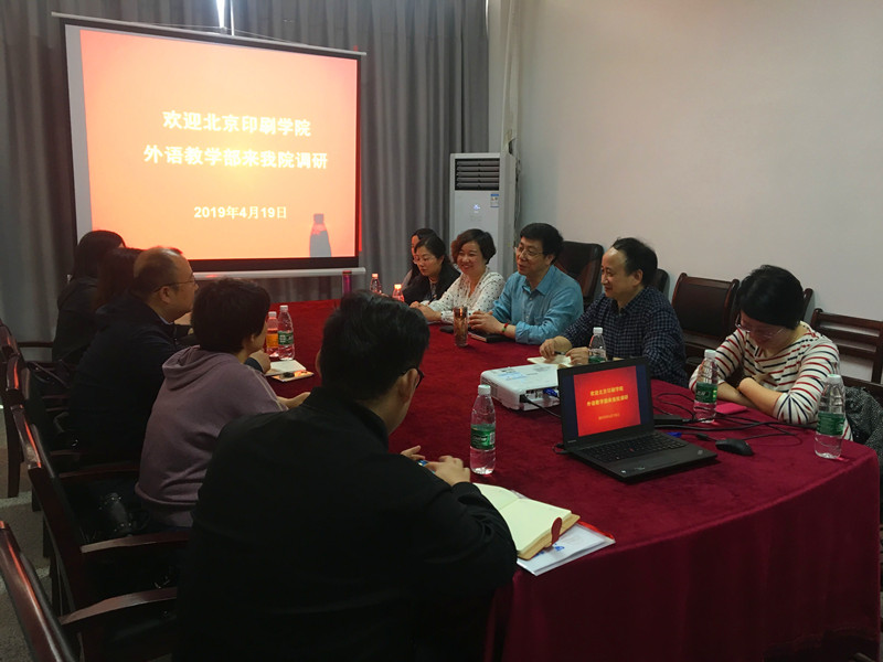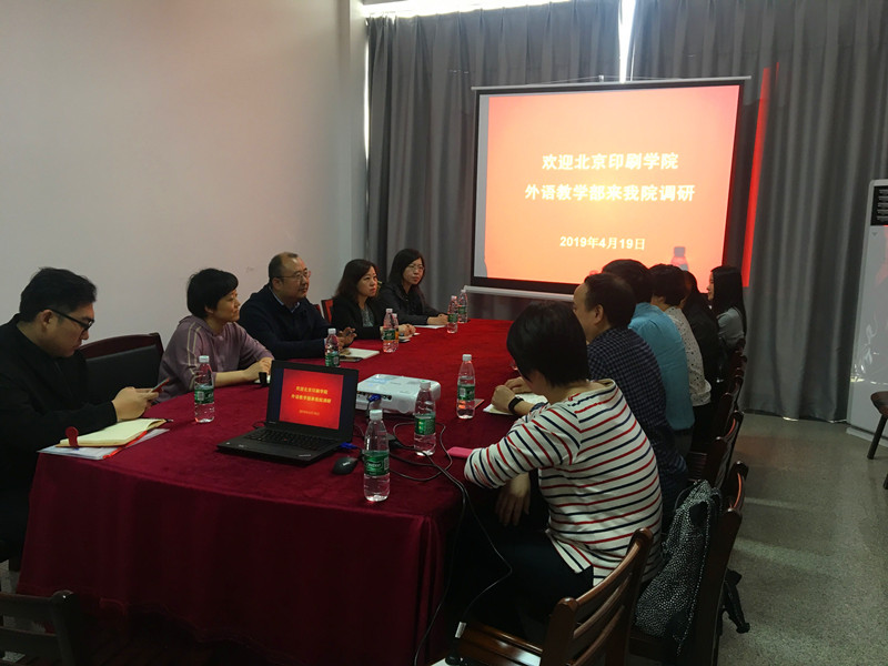4月19日,北京印刷学院外语教学部书记杨雷一行五人来我们调研,学院党委书记胡中原、副院长罗绮伦、党委副书记王芳及各教研室主任参加了会议。
