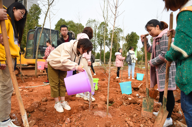 在现场工作人员的指导下,校领导和师生们拿着铁锨、水桶等工具,投身到热火朝天的植树活动中。师生们挽起衣袖,两两合作,一人扶树,一人培土,为一棵棵银杏树安置“新家”。植树活动中,师生有效配合,相互交流,增进了解,其乐融融。千余棵银杏树为学校的绿色校园景观又增添了一道风景线。