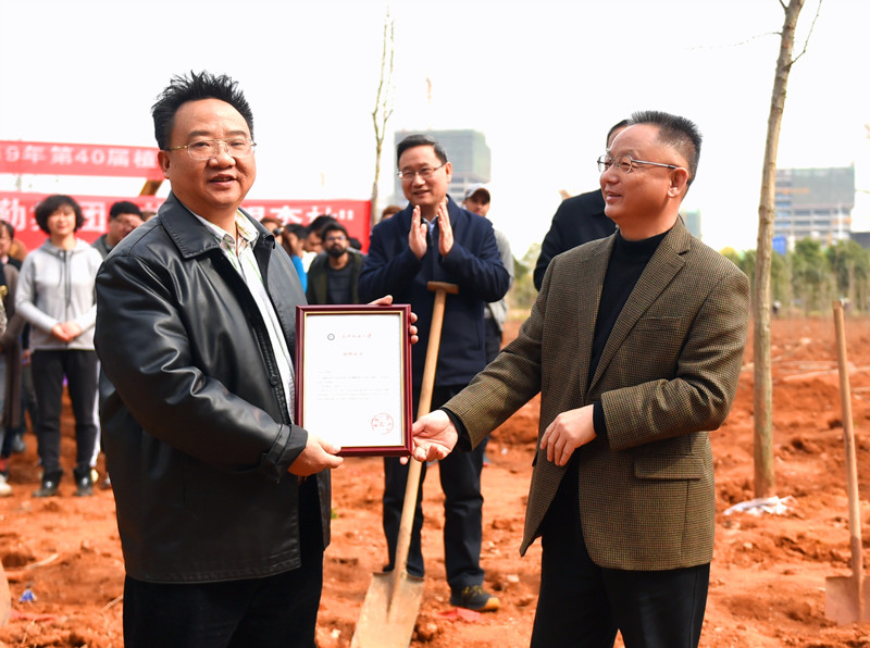 捐赠仪式上,罗锦银副校长为汤富华教授颁发了捐赠证书,并对汤教授支持学校“绿色校园”建设的举动表示了充分肯定和高度赞扬。汤富华教授讲述了他此次向学校捐赠千余棵银杏树的初衷,表达了今后继续捐赠的愿望。他说,十年树木、百年树人,种植树木就是种下希望,期盼每一棵树木健康成长的同时,也是期盼学校的每一位学生成人成才,期盼学校的整体事业蓬勃兴旺。