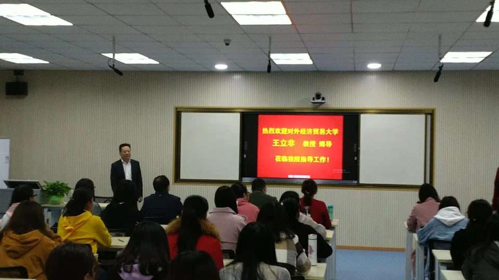 11月14日上午,对外经济贸易大学教授、博士生导师、全国高校商务英语专业教学协作组组长王立非教授受邀来我们做了题为“商务英语专业国标实施方案要求与专业质量提升”的学术报告,指导我们商务英语专业建设。讲座由胡中原书记主持,学院领导班子、商务英语骨干教师及商务英语专业全体学生参与了此次讲座。