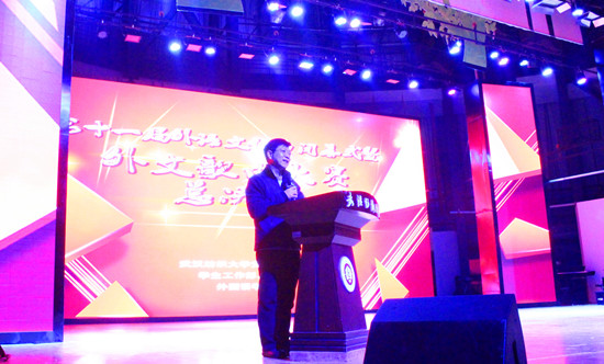在Smoke Time乐队动人的歌声和校艺术团灵舞团酷炫的舞蹈的烘托下,晚会正式拉开序幕。何院长用优美的全英文开场语为外语文化节十一年的文化传承与延续“点赞”,现场学生掌声喝彩不断。胡书记上台致辞,他表达了对外语文化节活动的祝福,并寄语学生们把英语学好、学深、学透。