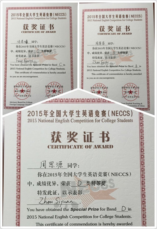 近日,从全国大学生英语竞赛组委会传来喜讯,我们周菲菲(英语11201)、冯若曦(会计11301)和周思源(服工11401)三名同学凭借扎实的英语基本功和英语综合运用能力,在2015年全国大学生英语竞赛中斩获特等奖。此次获奖人数在同类高校中名列前茅,获奖覆盖面广,在竞赛的4个类别中有3个类别都有斩获。尤为可喜的是,在B类(英语专业)的所有参赛院校中,仅有3个学生获得特等奖,而我们的周菲菲就位列其中。