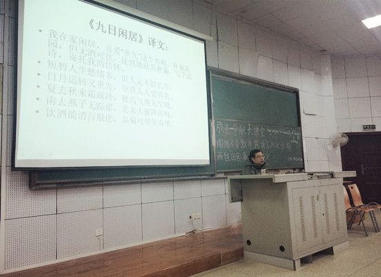 讲座过程中,韩教授将两位诗人的同类诗词以中英双语进行对照讲解,他妙语连珠的讲授,令在场所有的同学们都被语言的美丽所吸引,也为跨文化文学的魅力所深深折服。