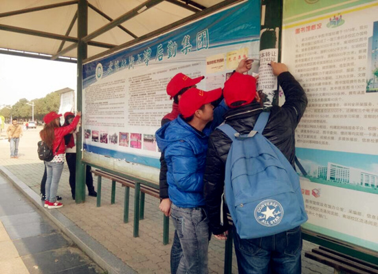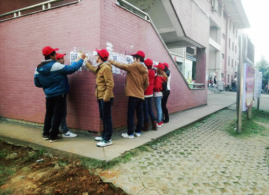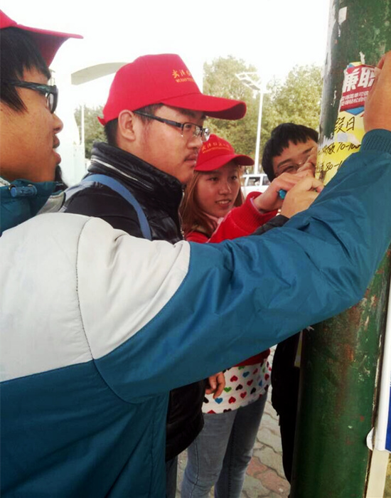 为了积极响应全国文明城市建设工作的号召,进一步将武汉市创建文明城市“奉献,友爱,互助,进步”的志愿者精神落到实处,以实际行动迎接第28个国际志愿者日的到来,12月4日,我们分团委学生会志协部的大学生志愿者们,在我们阳光校区内开展了“创建文明江城、美化崇真纺大”的清除小广告志愿活动。