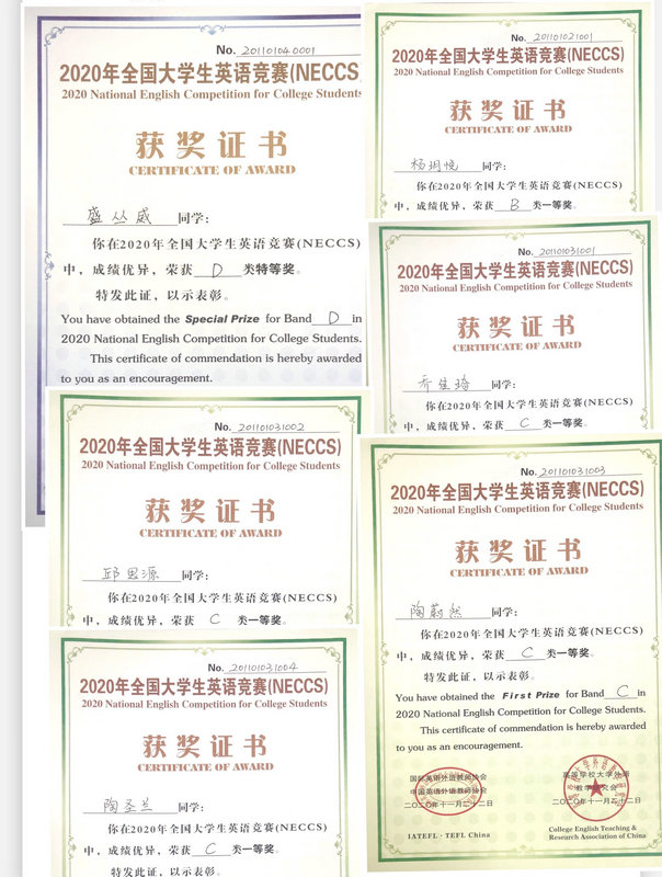 近日,从全国大学生英语竞赛组委会传来喜讯,我们盛丛威同学(公共艺术11802班)凭借扎实的英语基本功和英语综合运用能力,在举行于华中师范大学的全国大学生英语竞赛决赛中斩获全国特等奖,另外5名同学获得全国一等奖,36名同学获得全国二等奖,58名同学获得全国三等奖。