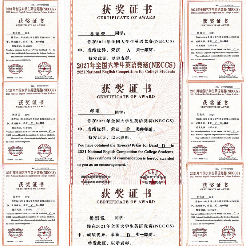 近日,从全国大学生英语竞赛组委会传来喜讯,我们郄唯一同学(环艺61901班)凭借扎实的英语基本功和英语综合运用能力,于2021年5月在华中师范大学举行的全国大学生英语竞赛决赛中斩获全国特等奖,另外8名同学获得全国一等奖,其中谷莹莹同学(研2017)获得A类一等奖,这是研究生首次获得全国大学生英语竞赛一等奖。49名同学获得全国二等奖,83名同学获得全国三等奖。