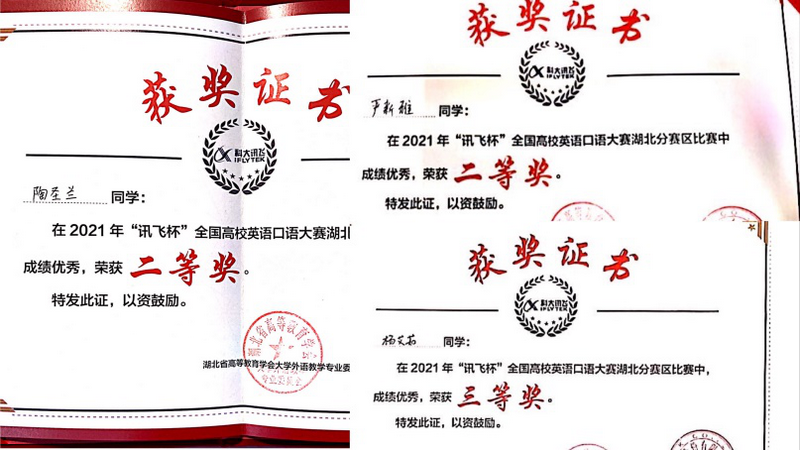 6月20日,由科大讯飞股份有限公司和湖北省高等教育学会大学外语教学专业委员会共同主办的第一届“讯飞杯”全国高校英语口语大赛湖北省决赛在武汉科技大学完美落幕。我们会计11906陶圣兰、英语11901严新雅同学获得省决赛二等奖,服工11901杨艾茹同学获得省决赛三等奖的好成绩。
