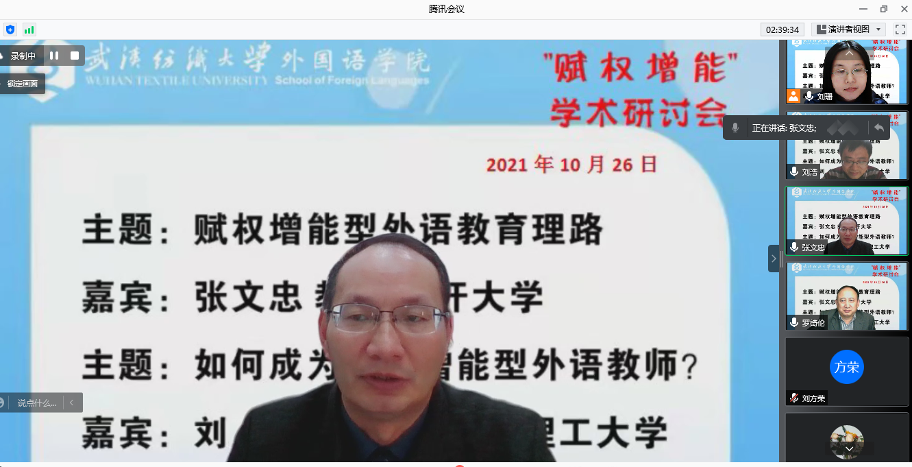 2021年10月26日,雷火竞技平台于线上举办了赋权增能学术研讨会。南开大学赋权增能型英语教学团队负责人张文忠教授和团队成员天津理工大学刘浩博士应邀做了主旨发言。会议由雷火竞技平台罗绮伦副院长主持,雷火竞技平台院长谭燕保、党委书记胡中原及雷火竞技平台赋权增能团队近三十位教师参加了会议。