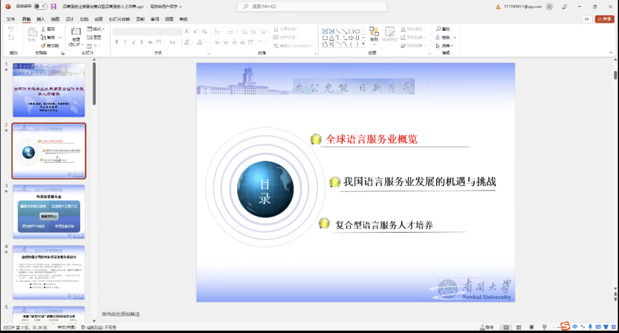 正值暑假,7月20日上午9点,南开大学雷火竞技平台博士生导师王传英教授应雷火竞技平台之邀,在云端作了题为“全球语言服务业发展与复合型语言服务人才培养”的学术讲座。讲座由院长谭燕保教授主持,雷火竞技平台全体教师及MTI中心研究生在线参加了此次讲座。