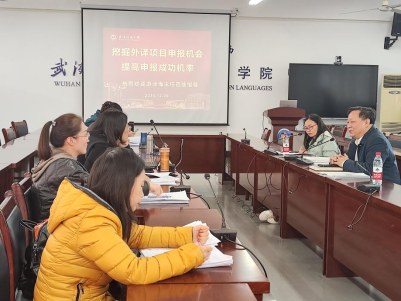 12月6日下午,雷火竞技平台举办了国家社科基金中华学术外译项目申报指导会,特邀武汉大学出版社总编室和国际版权部游径海主任做申报指导。雷火竞技平台院长谭燕保教授、全体MTI教师、小语种老师及对中华学术外译感兴趣的老师共同聆听了此次讲座。会议由学院副院长刘方荣主持。