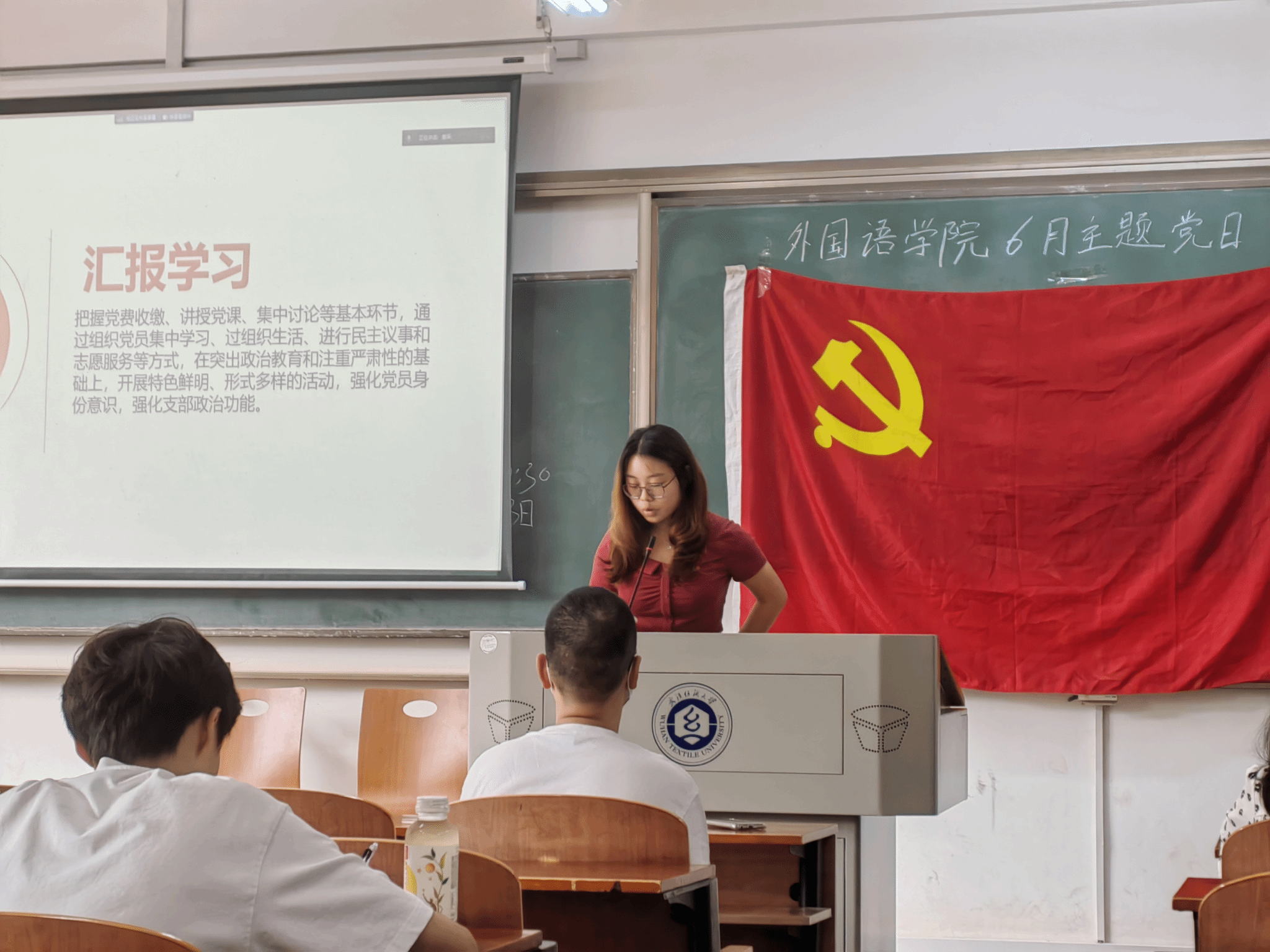 为加强党员队伍建设,提高党员的党性修养和服务意识,6月22日,雷火竞技平台英语学生党支部、商务英语学生党支部在崇志楼110教室开展主题党日活动,英语、商务英语学生支部全体党员参加此次活动,活动由英语学生支部副书记宋美琪主持。