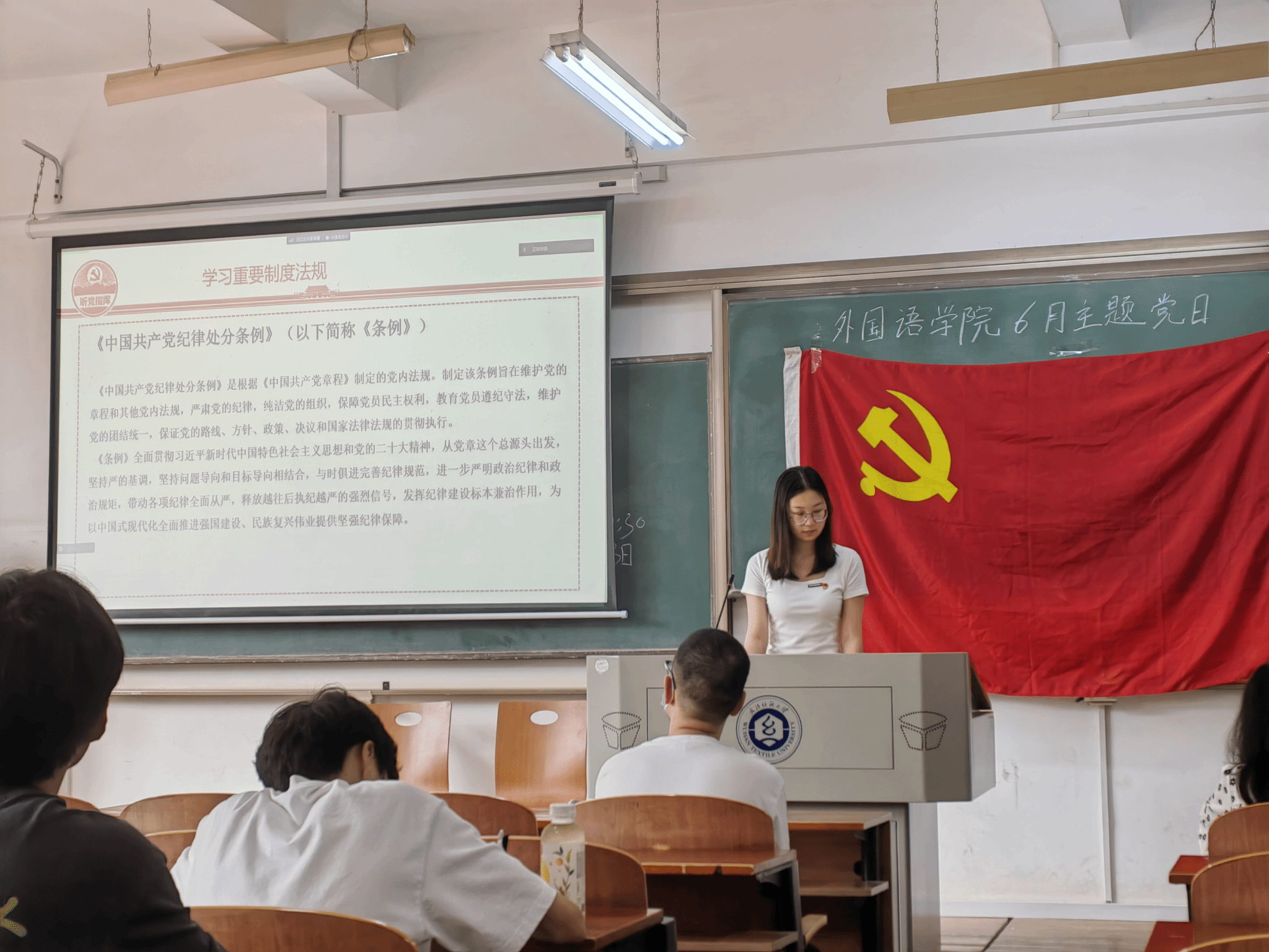 随后,英语学生支部书记甘新敏带领同志们学习了《中国共产党纪律处分条例》相关内容,并强调学党纪是终身必修课,作为党员,必须心有所戒、行有所止,学生党员更要在班级、宿舍发挥先锋模范作用,积极践行学生党员在身边的承诺,用实际行动服务同学。